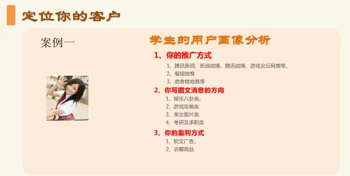 清晰的用户画像有助于你后期推广方法展开,还有你写图文信息的方向,最后还关联到的盈利模式。当然这是后面篇幅要展开讨论的问题,这里只根据上述两个用户画像,做下分析: